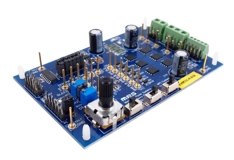 The EV6532-R-01A is an evaluation board for the MP6532, a three-phase brushless DC motor pre-driver. The MP6532 operates from a supply voltage of up to 45V. It is configured to drive three half-bridges consisting of six N-channel power MOSFETs.