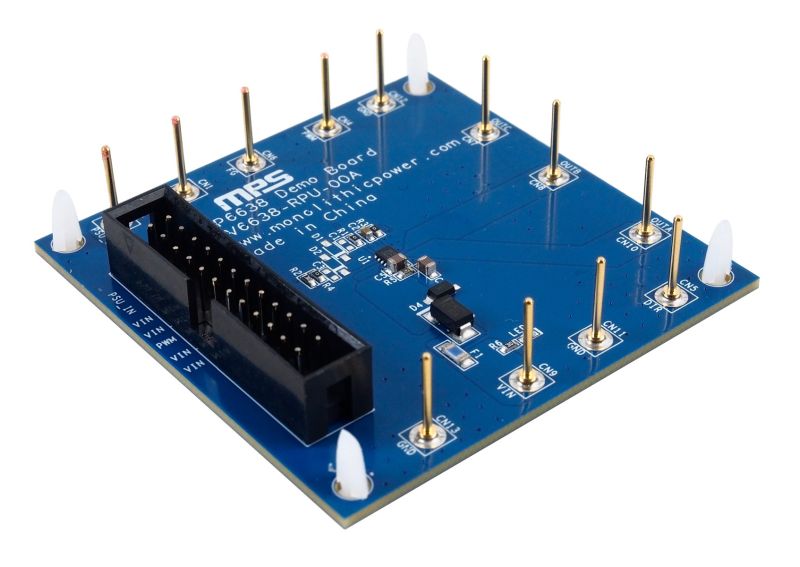 The EV6638-RPU-00A is an evaluation board designed to demonstrate the capabilities of the MP6638, a three-phase sensorless and brushless (BLDC) motor driver with integrated power MOSFETs. It features sinusoidal sensorless control for better efficiency and low vibration, with up to 1.7A of peak phase current. The input voltage (VIN) ranges from 2.5V to 15V.
