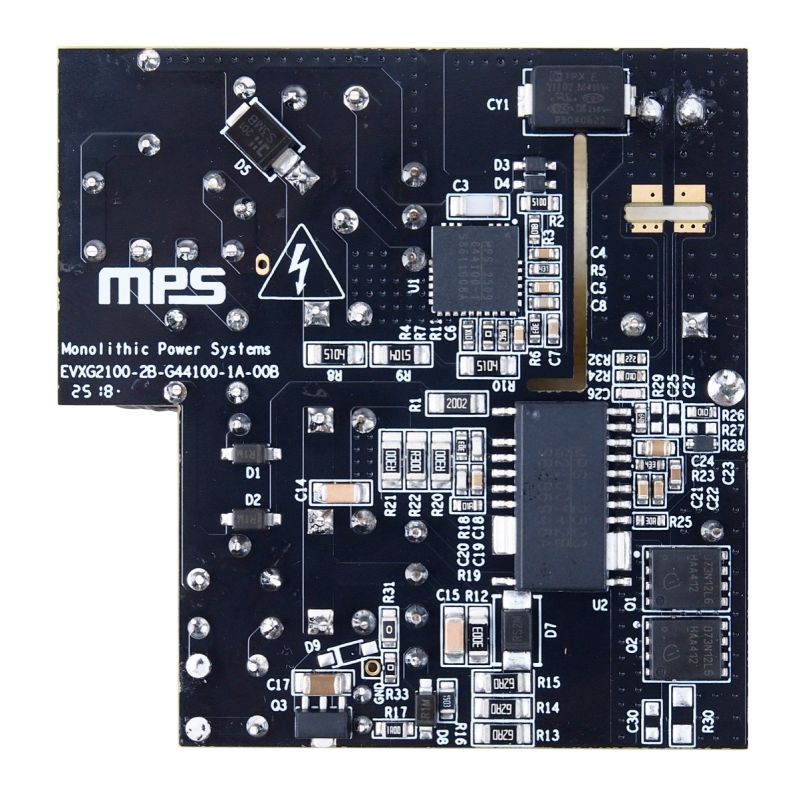 The EVXG2100-2B-G44100-1A-00B evaluation board is designed to demonstrate the performance of the MPXG2100-2B and the MPG44100-1A. It comes in a small form factor with high power density. The evaluation board’s electrical specifications are well-suited for cell phone and notebook adapters. It provides very low no-load power consumption (<85mW), and its high overall efficiency meets DOE Level VI and CoC Tier 2 standards. It can also meet IEC 61000-3-2 Class-D harmonics current limits.