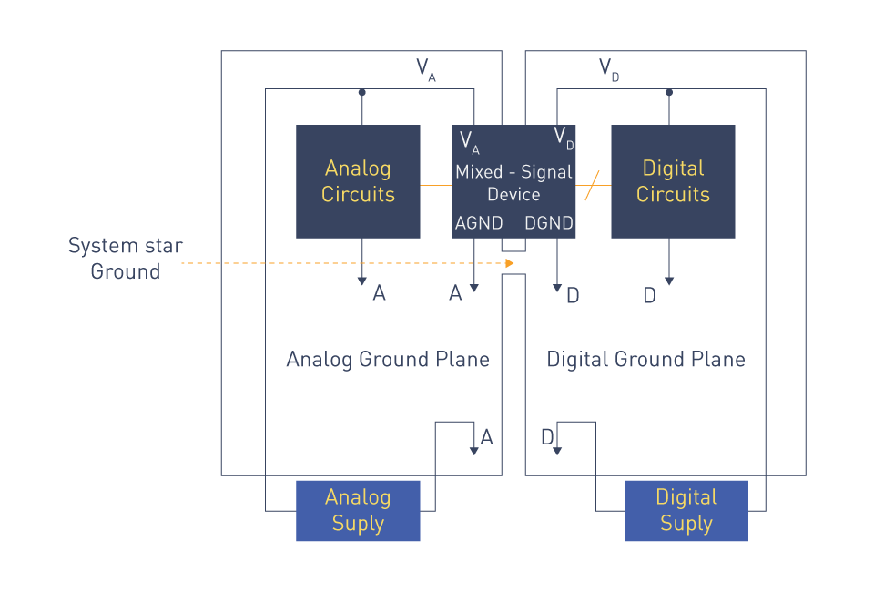Grounding Techniques: Proper grounding is crucial in mixed signal designs to prevent noise from coupling through the ground plane.