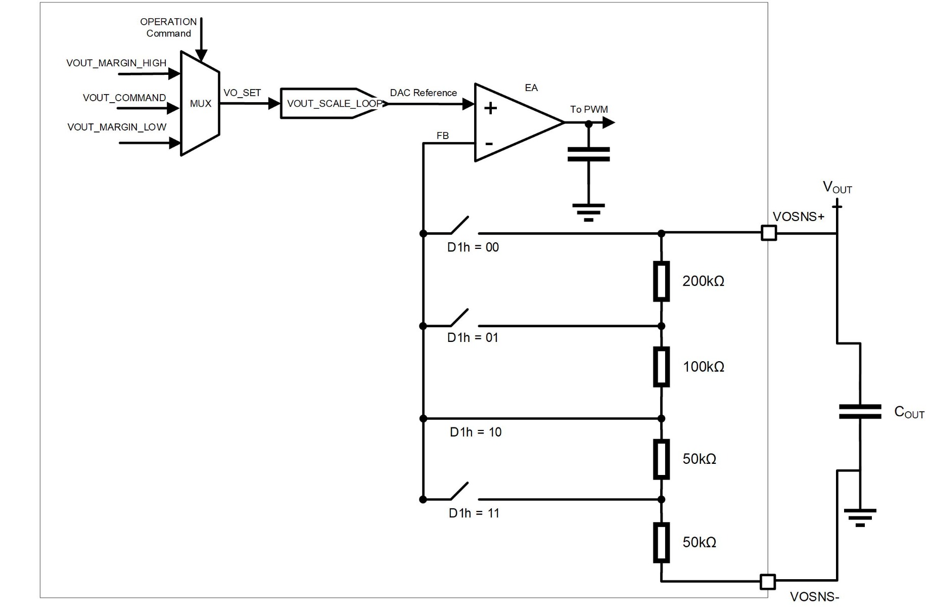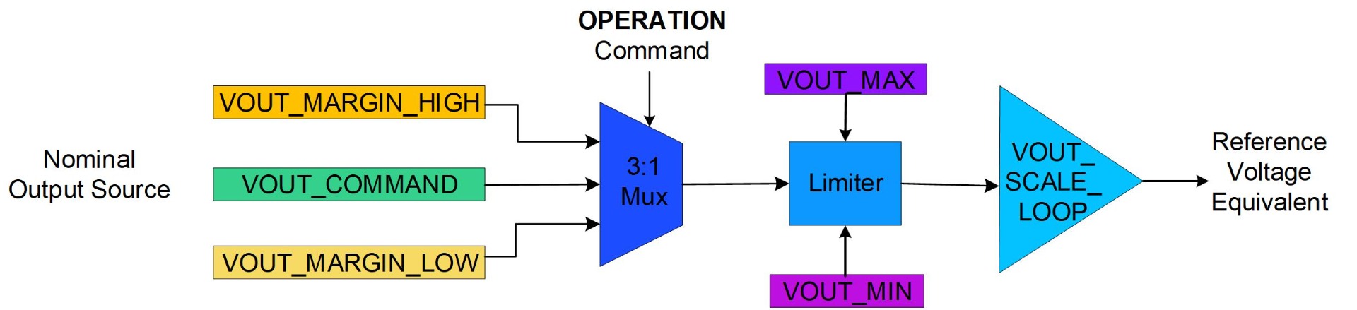 Once the selected voltage value is determined, it is compared to the VOUT limits set by the VOUT_MAX and VOUT_MIN commands. This ensures that VOUT remains within safe upper and lower thresholds. Finally, a scaling factor is applied to match a reference voltage.