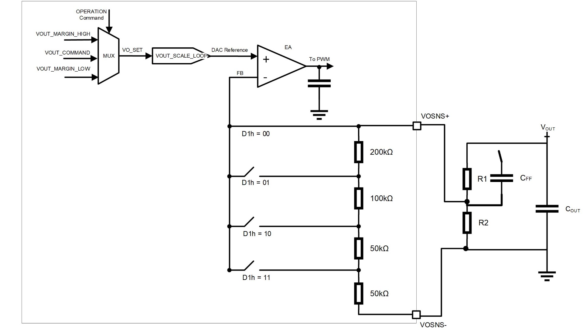 To optimize the load transient response, a feed-forward capacitor (CFF) must be placed in parallel with R1 (see Figure 5). Table 4 shows the VOUT range when using the external voltage divider through VOUT_SCALE_LOOP (29h) and MFR_CTRL_VOUT (D1h).