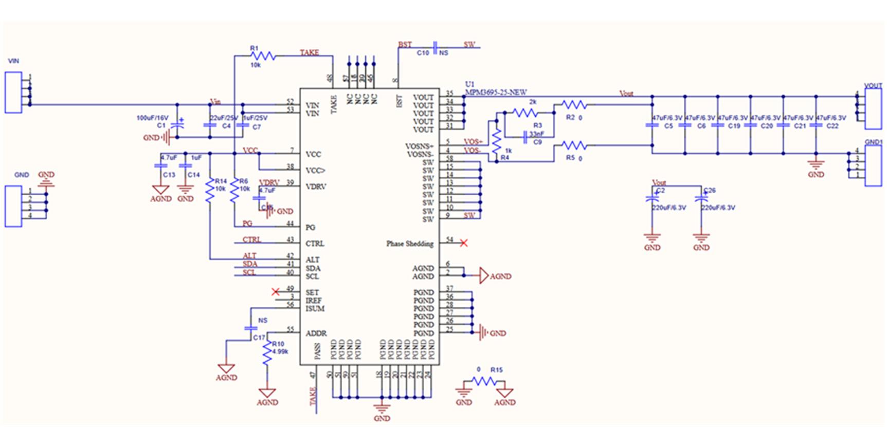 The MPM3695-25's evaluation board (EVM3695-25-RF-02A) in a single-phase configuration was used for this example. Figure 6 shows the circuit that was built.