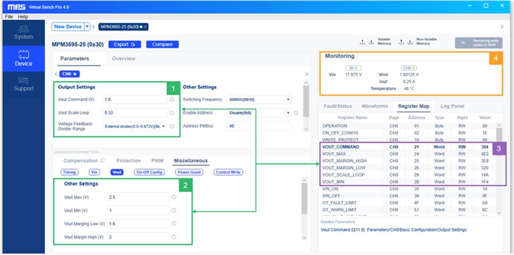 MPS’s Virtual Bench Pro 4.0 GUI provides an interface to configure the MPM3695 family. Figure 7 shows the main PMBus VOUT commands used in this example.