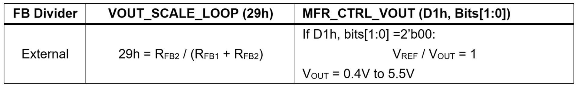 Table 3 shows the VOUT range using the internal voltage divider option through VOUT_SCALE_LOOP (29h) and MFR_CTRL_VOUT (D1h). While using the internal voltage divider, it is important to completely disconnect the external feedback (FB) resistors and select the appropriate voltage range according to the desired application.