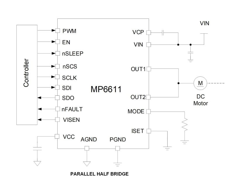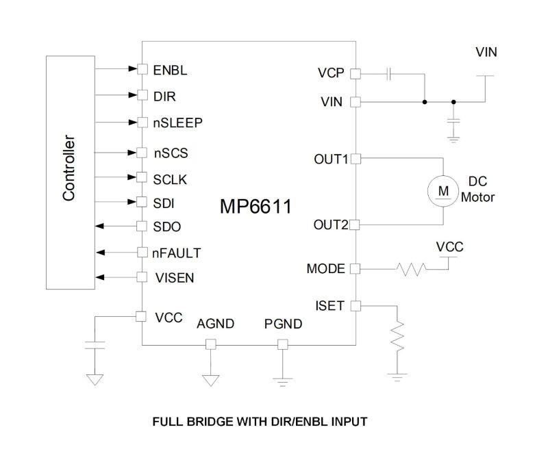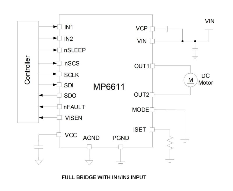 The MPQ6611-AEC1 operates on a motor power supply voltage from 2.7V to 32V, and it can supply an output current (IOUT) of up to 7A. A very low standby circuit current can be achieved when the device is disabled.