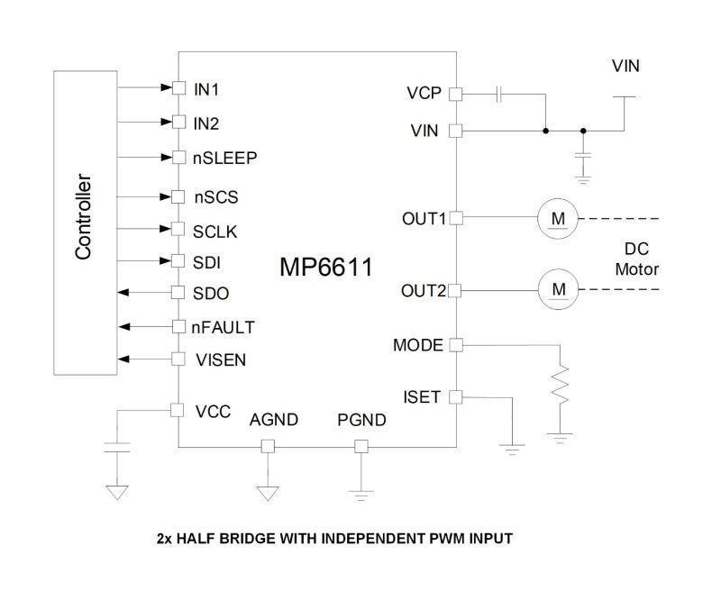 For the MPQ6611-AEC1, control of the outputs is accomplished through the IN1/ENBL/PWM and IN2/DIR/EN pins, through the serial interface, or a combination of both. A mode pin is used to set the control modes, such as the input signal logic (IN1/IN2, DIR/ENBL, or independent pulse-width modulation (PWM)).