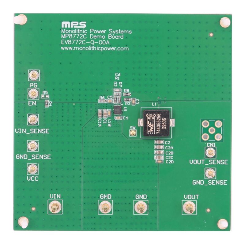 The EV8772C-Q-00A is an evaluation board designed to demonstrate the capabilities of the MP8772C, a fully integrated, high-frequency, synchronous, rectified, step-down, switch-mode converter with internal power MOSFETs. The MP8772C offers a very compact solution that achieves up to 12A of continuous output current (IOUT), with excellent load and line regulation across a wide input voltage (VIN) range. The converter uses synchronous mode operation for a higher efficiency across the IOUT load range.
