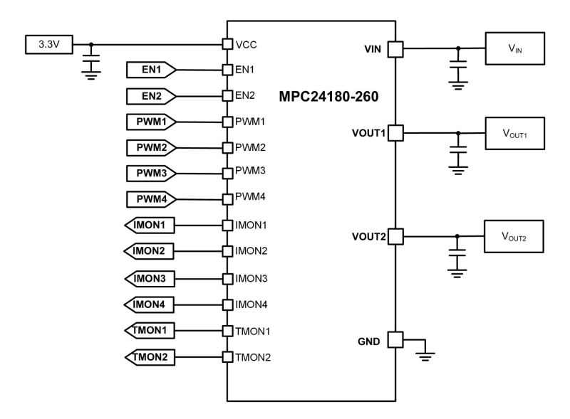 The MPC24180-260 is a four-phase, non-isolated, high-efficiency step-down Intelli-ModuleTM. It integrates the driver MOSFETs (DrMOS), inductors, and output capacitors to provide high efficiency and a small footprint, which is ideal for server applications.