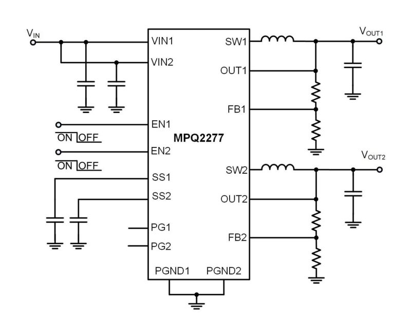 The MPQ2277-AEC1 is a monolithic, dual, step-down switch-mode converter with built-in internal power MOSFETs. The device achieves 1A/1A of output current (IOUT) from a 2.5V to 6V input voltage (VIN) range, with excellent load and line regulation. The output voltage (VOUT) can be regulated to as low as 0.6V.