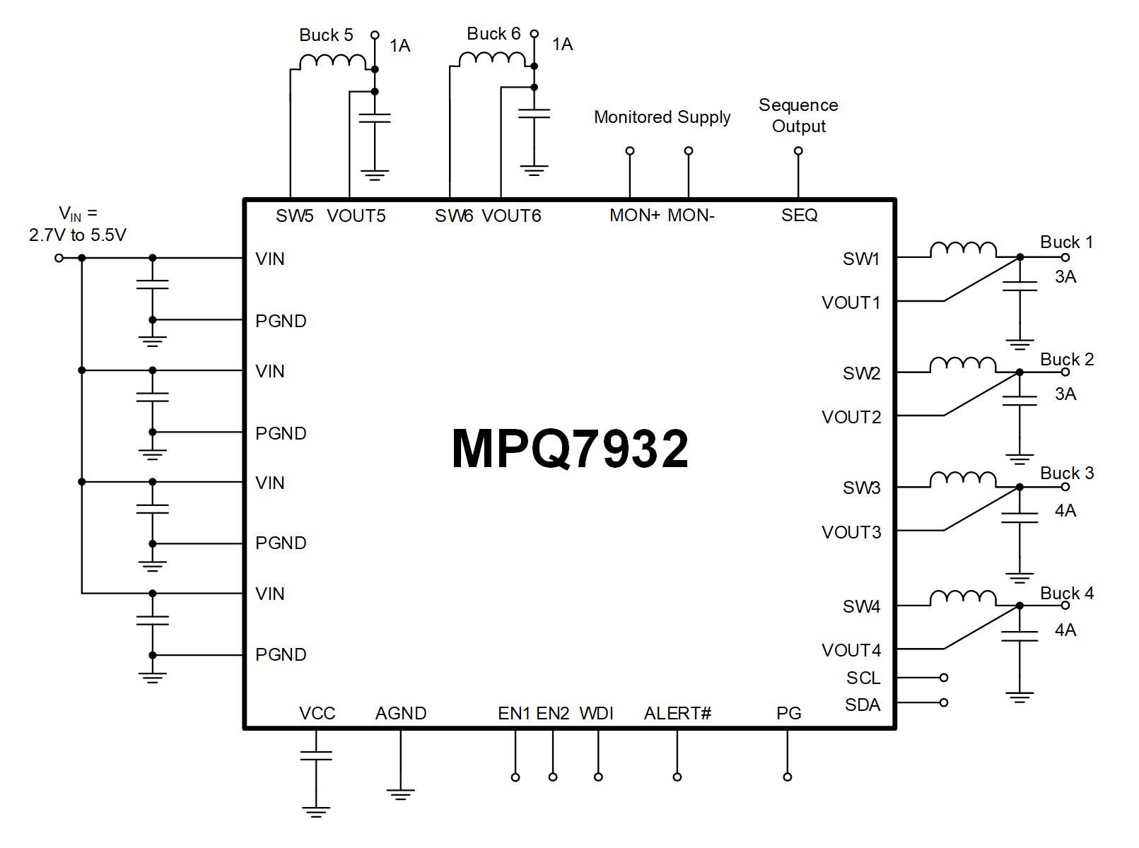 MPQ7932-AEC1PRODUCTMPSafeTM-Compatible, 5.5V PMIC with 6 Buck Converters, AEC-Q100 Qualified