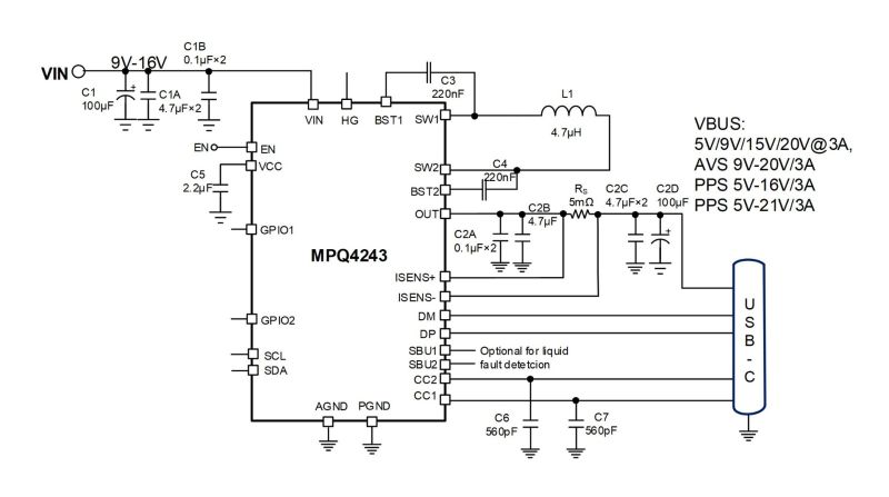 The MPQ4243-AEC1 is a fully integrated USB power delivery (PD) solution for USB Type-C sourcing ports. It integrates a buck-boost converter with four power switches and a USB PD controller. The device achieves up to 5A of continuous output current (IOUT) across a wide input supply range.