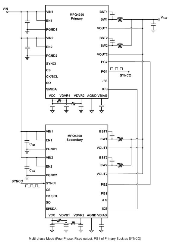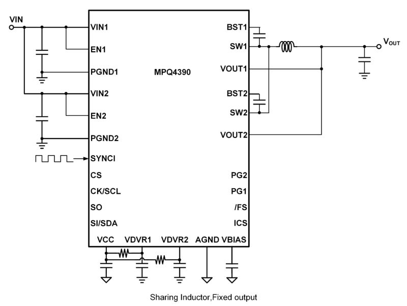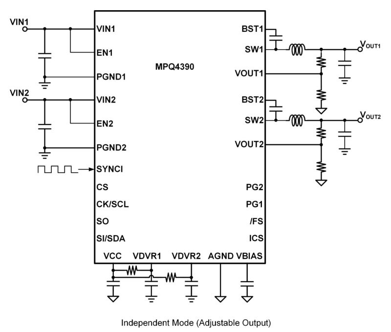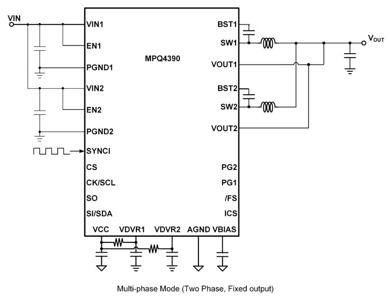 The MPQ73350FS-AEC1 can be selected to operate in either 2-channel mode or single-output multi-phase mode. For 2-channel mode, the output current (IOUT) for each buck is up to 7A with the capability for 12A with a heatsink. Multiple MPQ73350FS-AEC1 chips can be placed in parallel to support up to four phases. The switching frequency (fSW) is configurable from 200kHz to 2.2MHz, or it can be synchronized via an external clock signal. Frequency spread spectrum (FSS) is featured to improve EMI performance.