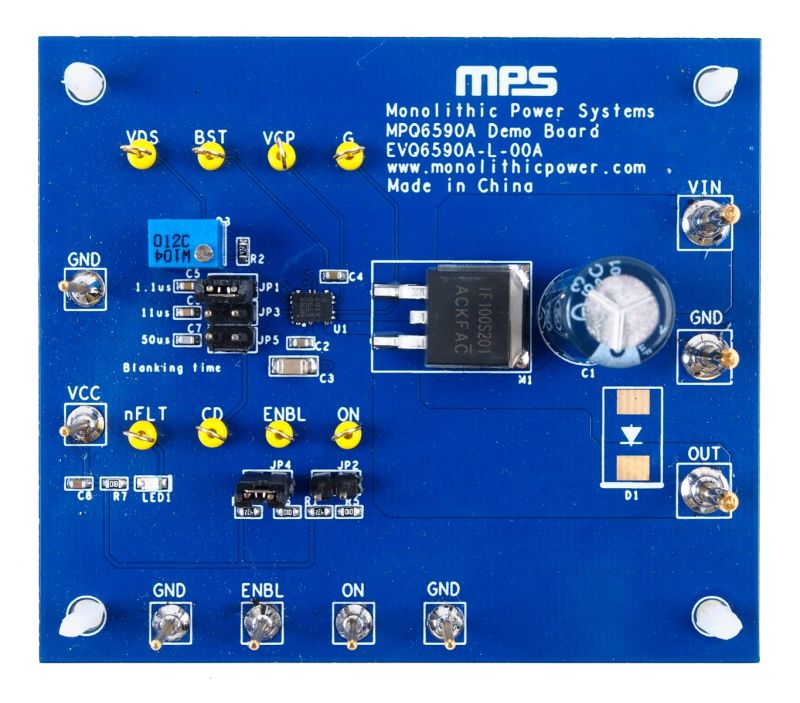 The EVQ6590A-L-00A is an evaluation board designed to demonstrate the capabilities of the MPQ6590A-AEC1, a high-side N-channel power MOSFET gate driver. It is suitable for battery power tools and automotive high-side switches.