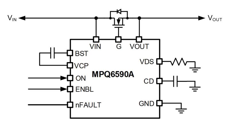 The MPQ6590A-AEC1 operates across a 7.5V to 80V input voltage (VIN) range. It can generate a gate drive voltage that exceeds the input supply to drive an N-channel gate. The device can source and sink 1A of current to quickly enable and disable large power MOSFETs. The MPQ6590A-AEC1 has an output tolerance of -70V, which allows an external MOSFET to avalanche without the need for an additional protection diode.