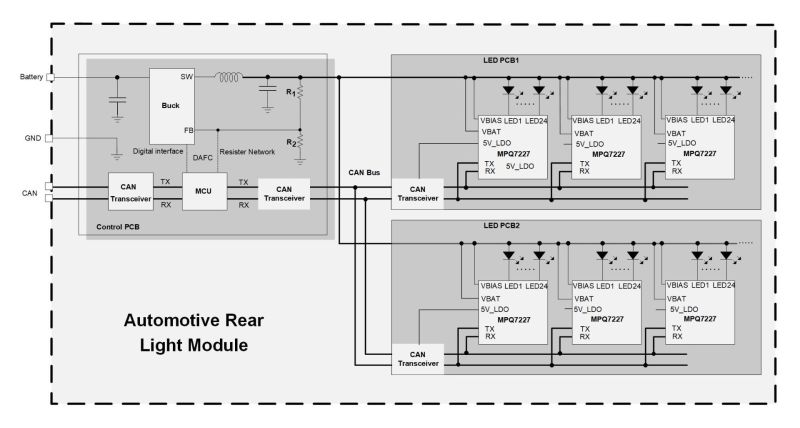 The MPQ76300FS-AEC1 is a 24-channel, smart linear LED driver. Each channel is rated for up to 100mA of current, and 32 ICs can be cascaded together to create a 768-channel solution. The device is optimized for animated or dynamic lighting applications. It employs a 12-bit pulse-width modulation (PWM) dimming register and a 6-bit analog dimming register for each channel, enabling individual channel control. The 24 channels can be assigned to up to 4 different groups with independent dimming frequencies and duty cycles. The LED current (ILED) ramp rate and phase shift between channels during PWM dimming can also be digitally configured. The MPQ76300FS-AEC1 is designed to function across distant PCBs with a robust high-speed UART over CAN interface.