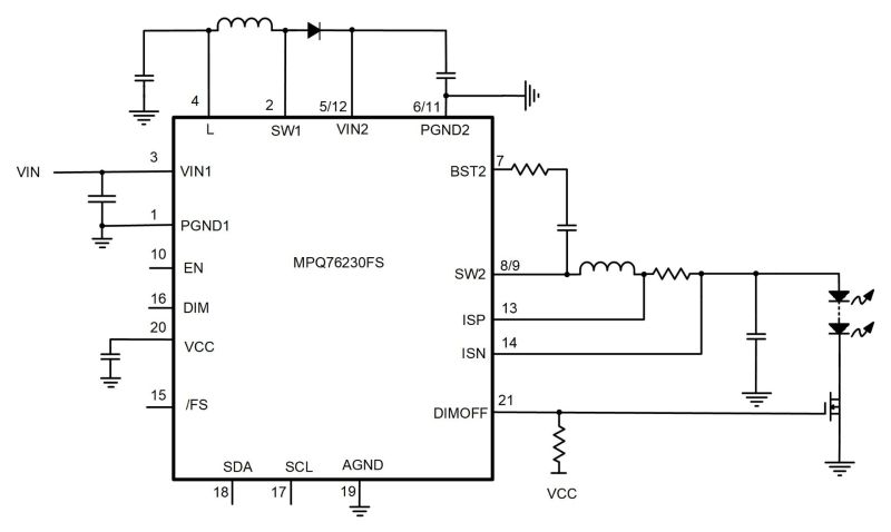 The MPQ76230FS-AEC1 requires a minimal number of standard external components and is available in a space-saving QFN-21 (4mmx4mm) wettable flank package. It is available in AEC-Q100 Grade 1.