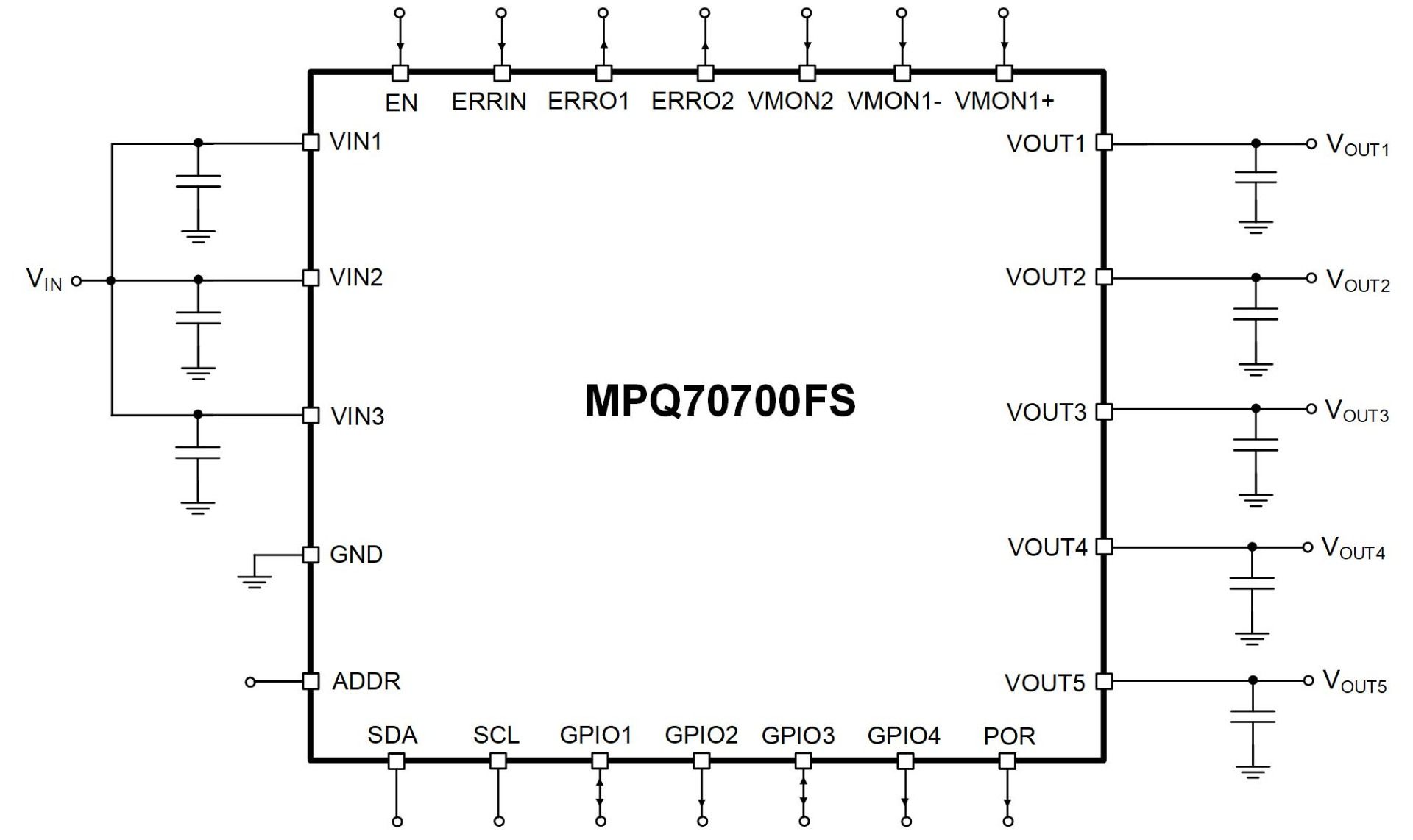 The MPQ7928-AEC1’s configurable parameters are set via the I2C digital interface without requiring any additional hardware changes, which allows for application flexibility. The output voltage (VOUT), power sequence, and protection thresholds can all be adjusted through the interface.