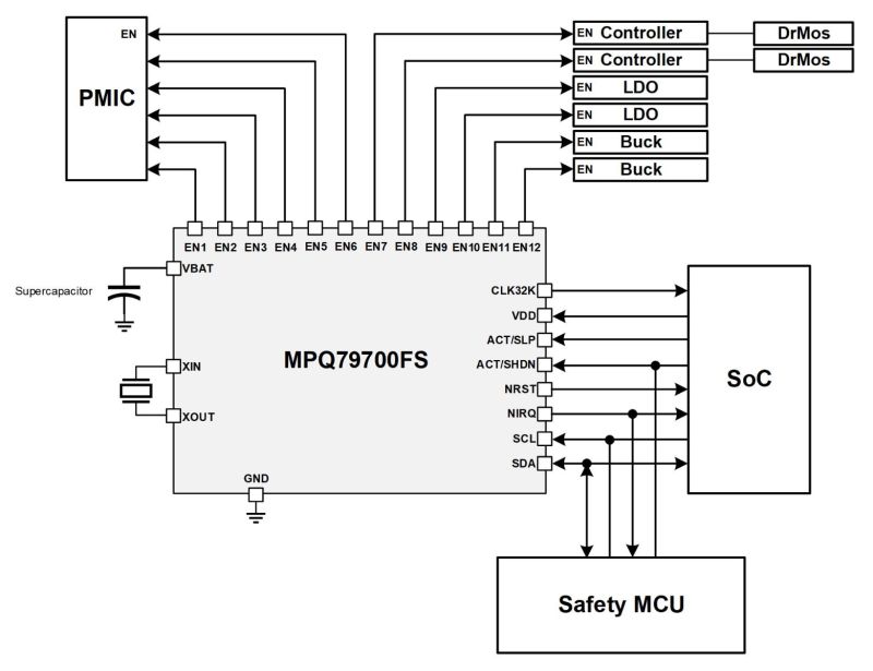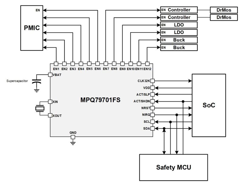 The MPQ79700FS-AEC1 is a 12-channel, functional safety power sequencer engineered to provide precise power sequencing and safety functions for automotive advanced driver-assistance systems (ADAS) and autonomous driving platforms.