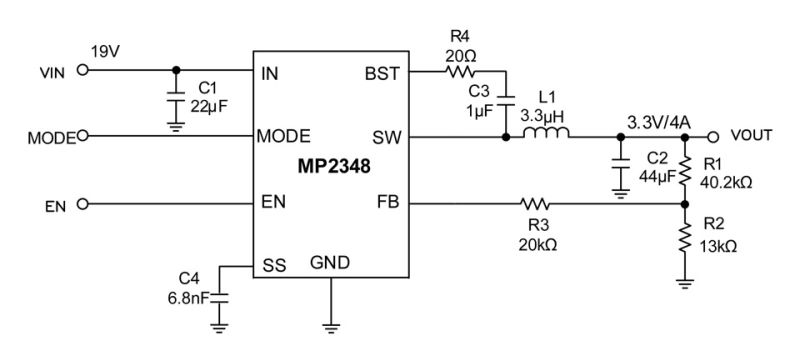 The MP2348 is a fully integrated, high-frequency, synchronous, rectified, step-down, switch-mode converter with internal power MOSFETs. It offers a compact solution to achieve 4A of continuous output current across a wide input range, with excellent load and line regulation. The MP2348 has synchronous mode operation for higher efficiency across the output current load range.
