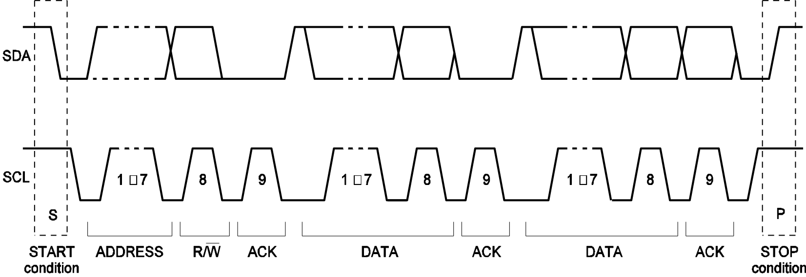 Every byte put on the SDA line must be 8 bits long. Each byte must be followed by an acknowledge (ACK) bit. The acknowledge-related clock pulse is generated by the master. The transmitter releases the SDA line (high) during the acknowledge clock pulse. The receiver must pull down the SDA line during the acknowledge clock pulse, so that it remains stable low during the high period of the clock pulse.
