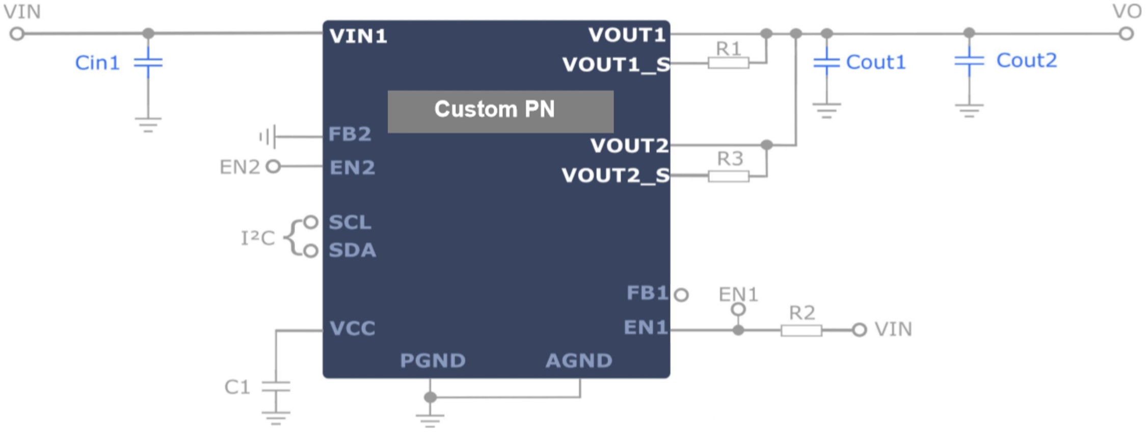 PMBus is a two-wire, bidirectional serial interface, consisting of a data line (SDA) and a clock line (SCL). The lines are externally pulled to a bus voltage when they are idle. Connecting to the line, a master device generates the SCL signal and device address, and arranges the communication sequence. The device interface is a PMBus slave that supports both fast mode (400kHz) and high-speed mode (3.4MHz), adding flexibility to the power supply solution. The output voltage, transition slew rate, and other parameters can be instantaneously controlled via the PMBus interface.