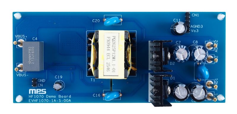 The EVHF1070-1A-S-00A provides a reference design for a universal, isolated power supply with a 12.5V/2A, 19V/1A output.