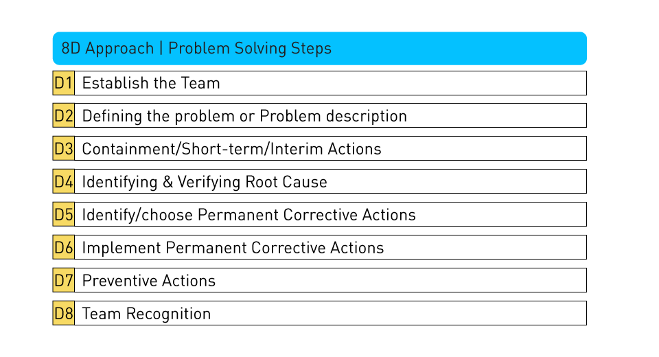 自動車における8D解析の実例: 現場から返却されたECUで観察された障害のトラブルシューティング時に8-D分析が効果的であることが証明された例です。このプロセスでは、ECUまたはその個々の部品の設計、または、製造上の問題に起因する主な原因を体系的に特定します。その後、再発を防ぐための予防措置を確実に講じながら、是正措置を実施します。システム内の根本原因の潜在的な場所に応じて、8-D分析は自動車メーカーまたは部品メーカーによって実行されます。自動車の分野では、8D分析を実施し、製品を進化させることが重要です。