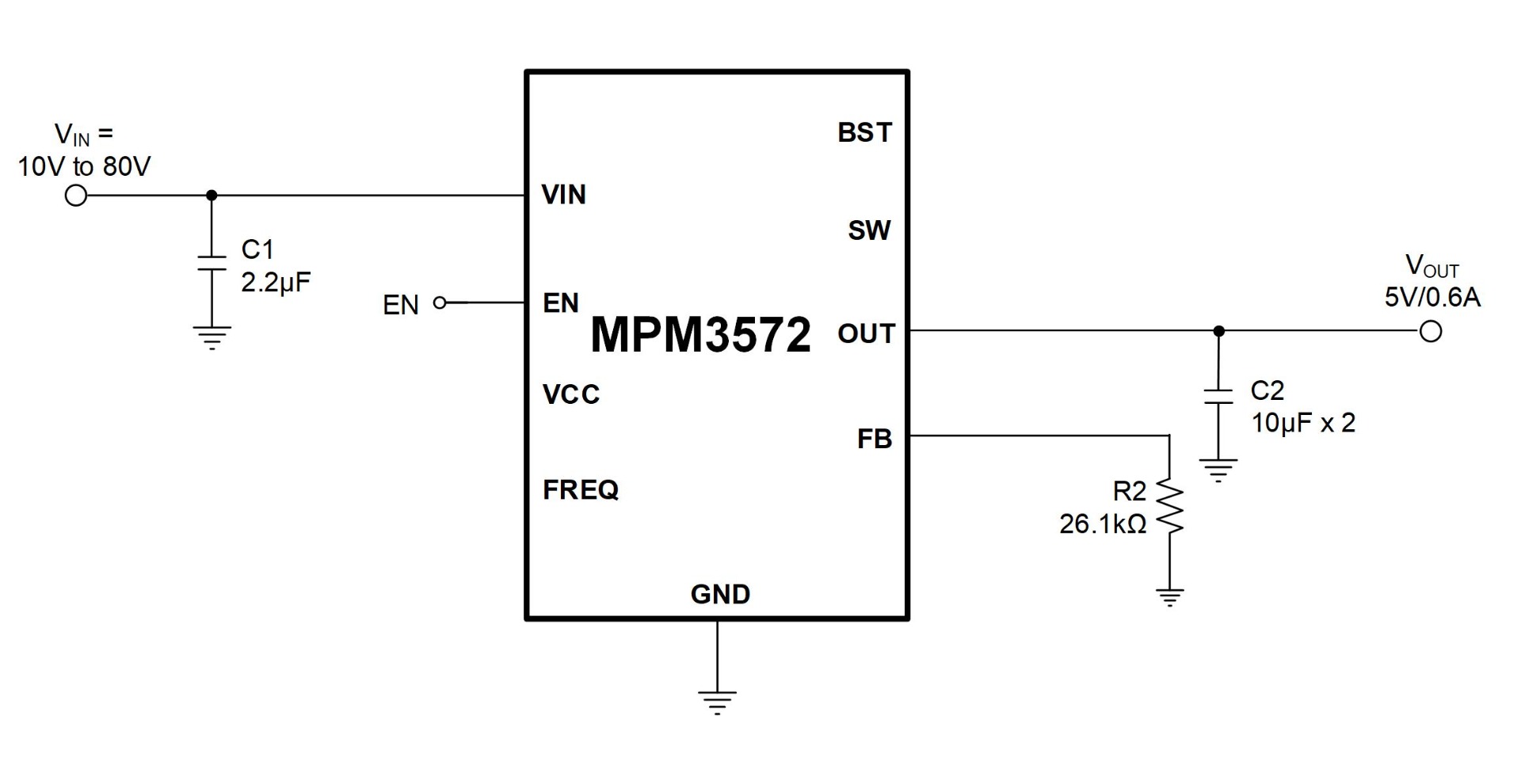 80V入力、0.6A、機能集積型、同期整流、ステップダウン電源モジュール