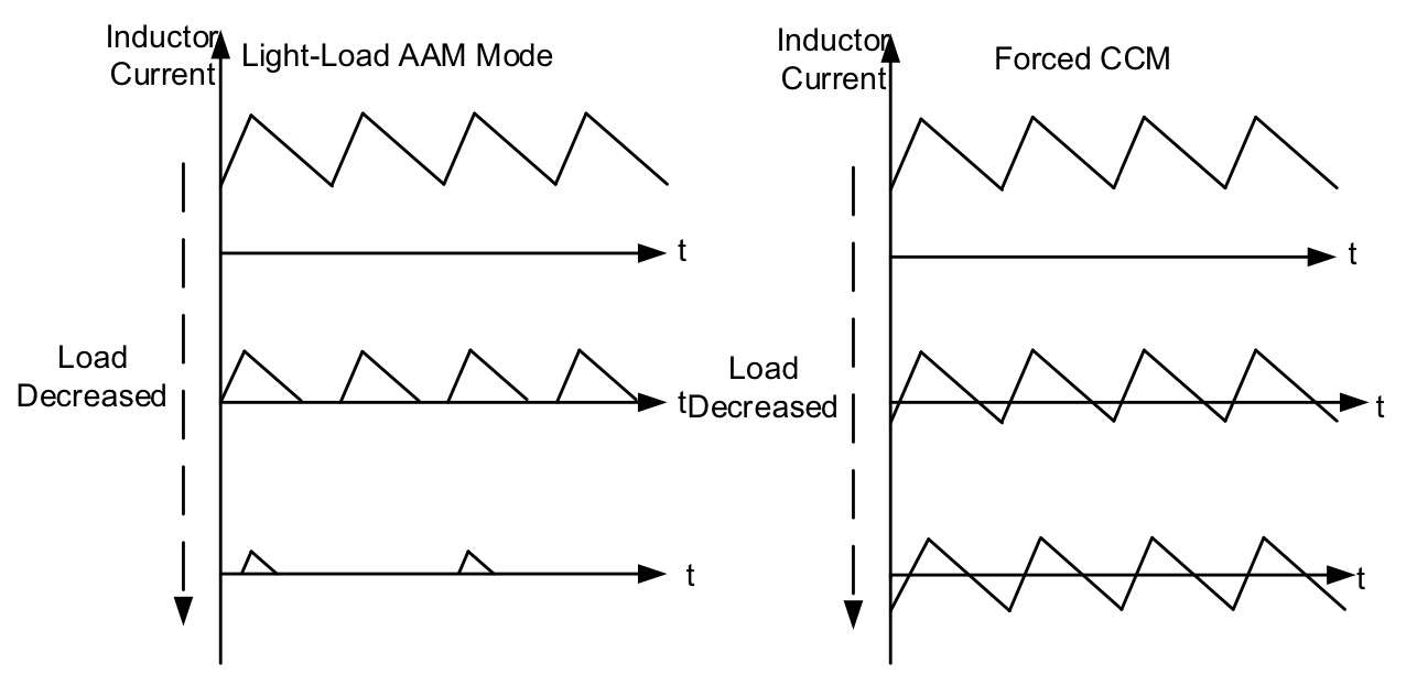 The programmable frequency dithering feature of this device allows either 3/48 or 3/28 variation range in the switching frequency, with a 120µs or 150µs dithering cycle. Both the frequency dithering range and cycle can be set by the I2C interface.