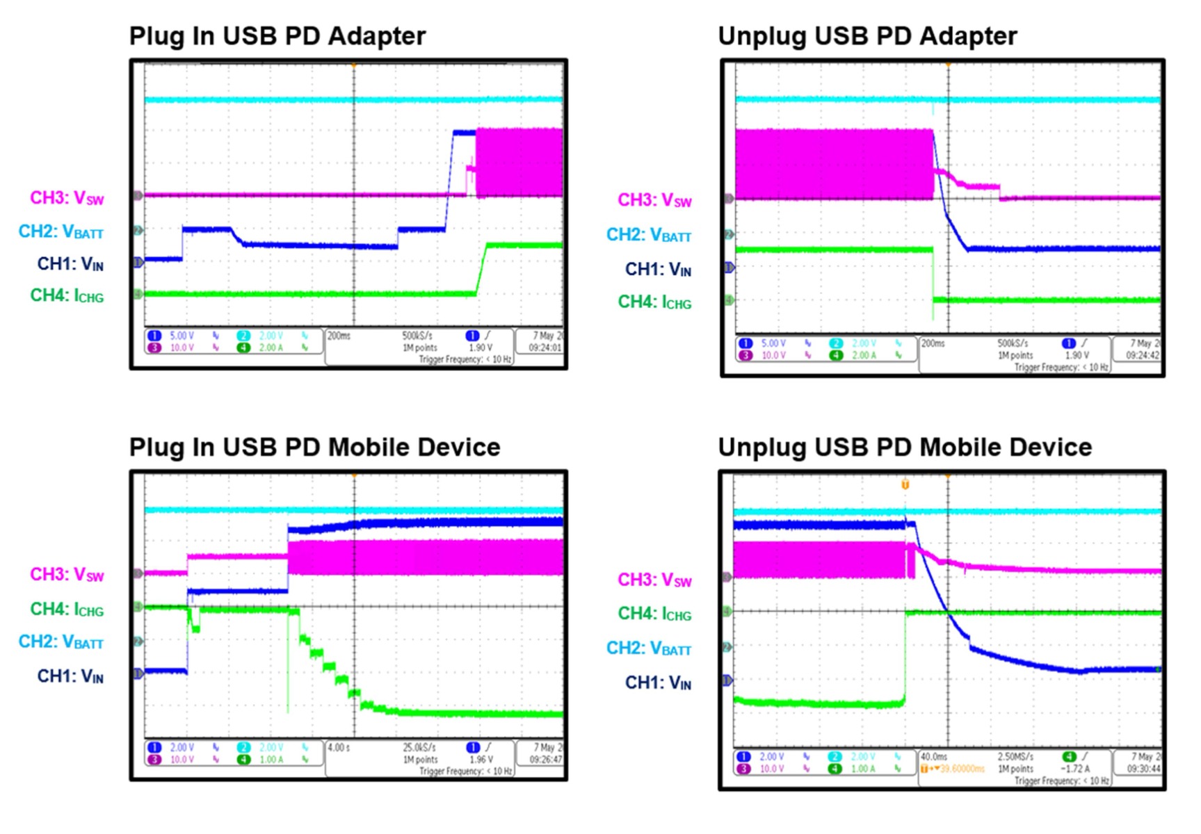 VBUS starts up automatically at the voltage set by the PD protocol sniffer or mobile device. The PD protocol sniffer can select different PDO outputs. The default PD output power (POUT) is 27W. The battery discharge current limit is 6.4A.