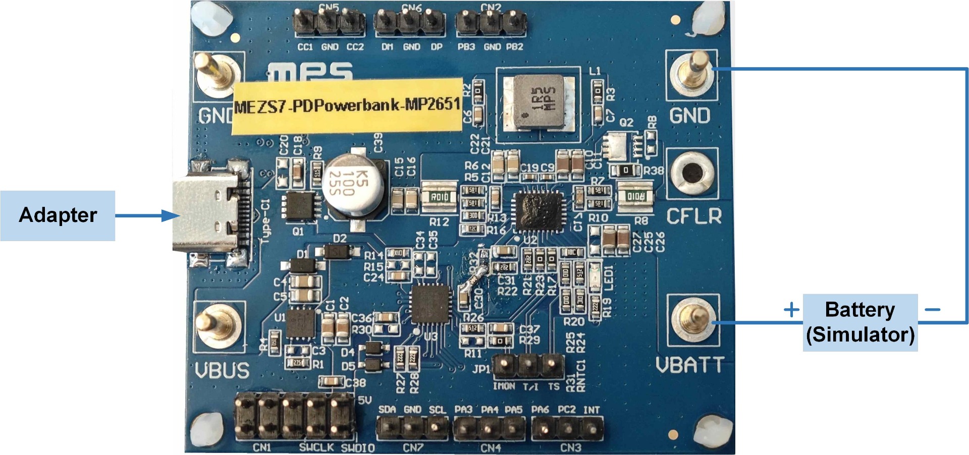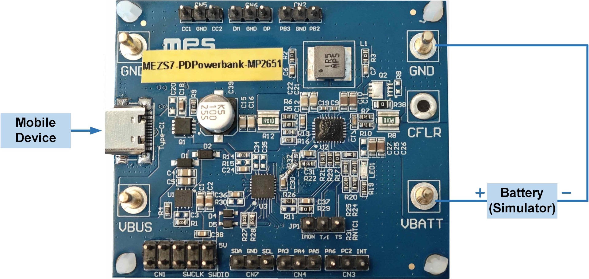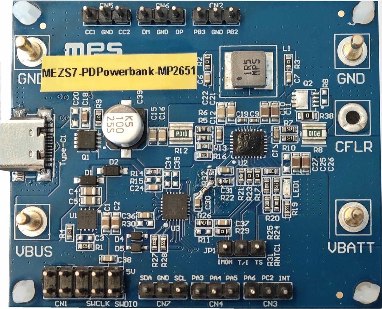 The MEZS7-PDPowerBank-MP2651 solution module is a reference design for USB PD applications, and includes a DRP USB Type-C port. The charge current is preset to 3A, and the charge-full voltage is preset to 8.4V for a 2-cell series Li-ion battery. In reverse source mode, the output is preset at 5V/3A or 27W PD.