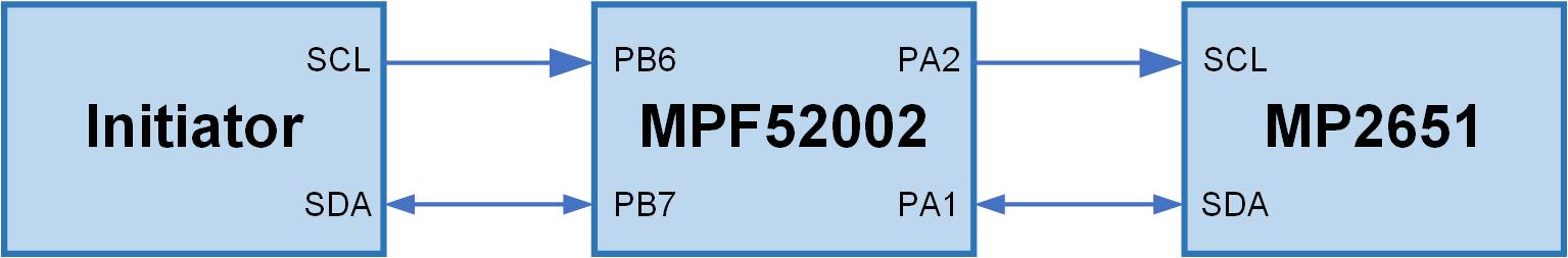 The MP2651 and the MPF52002 can be controlled or monitored via the I2C between the MPF52002 and the I2C initiator. The initiator should connect to the MPF52002 via PB6 and PB7 instead of the MP2651 (see Figure 3). The MPF52002 periodically reads the charge parameters, alerts the status of the MP2651, and updates the information to the I2C target registers. The initiator can also send some I2C commands to the MP2651 through the MPF52002.