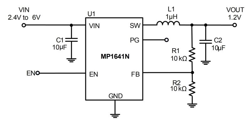 The MP1641N is a monolithic, step-down, switch-mode converter with built-in internal power MOSFETs. The device achieves up to 1A of continuous output current (IOUT) from a 2.4V to 6V input voltage (VIN), with excellent load and line regulation. The output voltage (VOUT) can be regulated to as low as 0.6V.