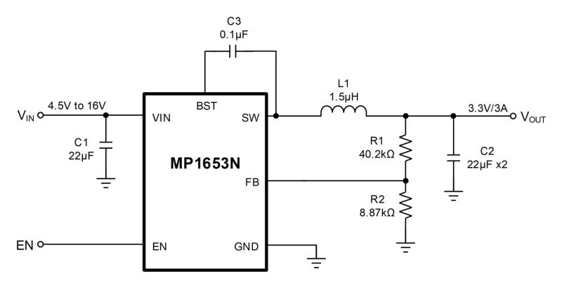 The MP1653N can achieve up to 3A of continuous output current (IOUT) from a 4.5V to 16V input voltage (VIN) range, with excellent load and line regulation. The output voltage (VOUT) can be regulated to as low as 0.6V.