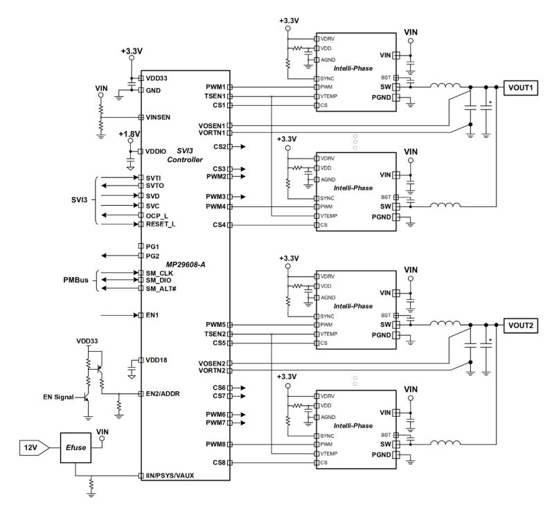 The controller provides an on-chip non-volatile memory (NVM) to store and restore device configurations. Device configurations and fault parameters can be easily configured or monitored via the PMBus/I2C interface. The MP29608-A can monitor and report the output current (IOUT) by sensing the current-sense output of the Intelli-PhaseTM devices.