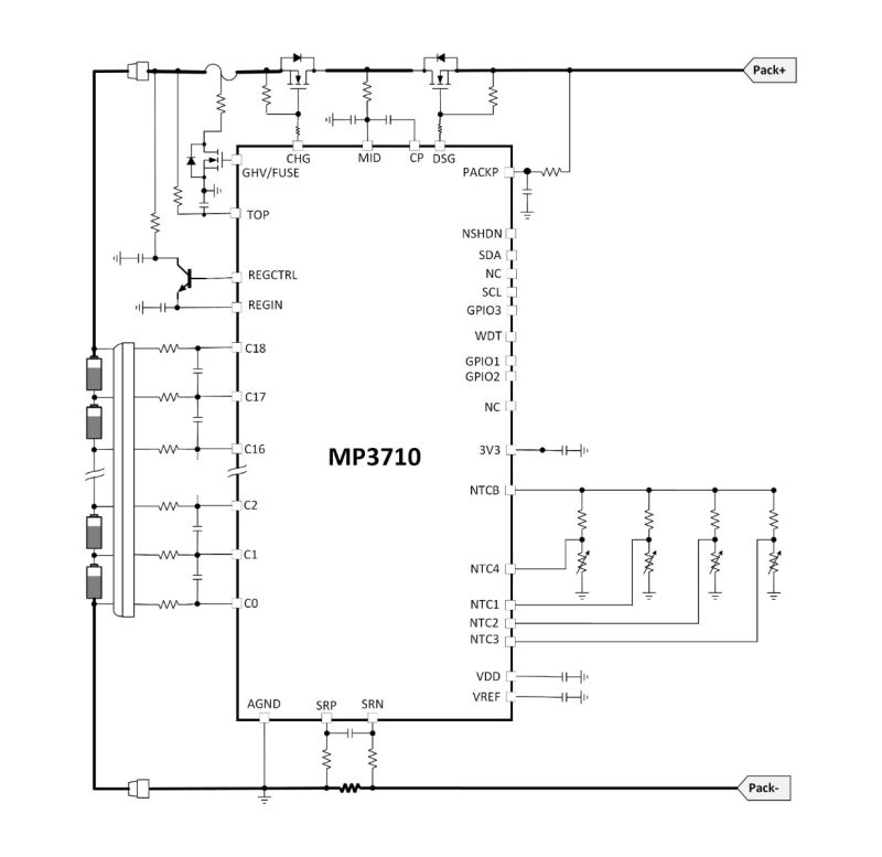 The MP2798 is a robust battery management device providing a complete analog front-end (AFE) monitoring and protection solution. The device can support I2C or serial peripheral interface (SPI) communication. It supports connections for 3-cell to 18-cell series battery packs, with an absolute voltage exceeding 80V on particular pins.
