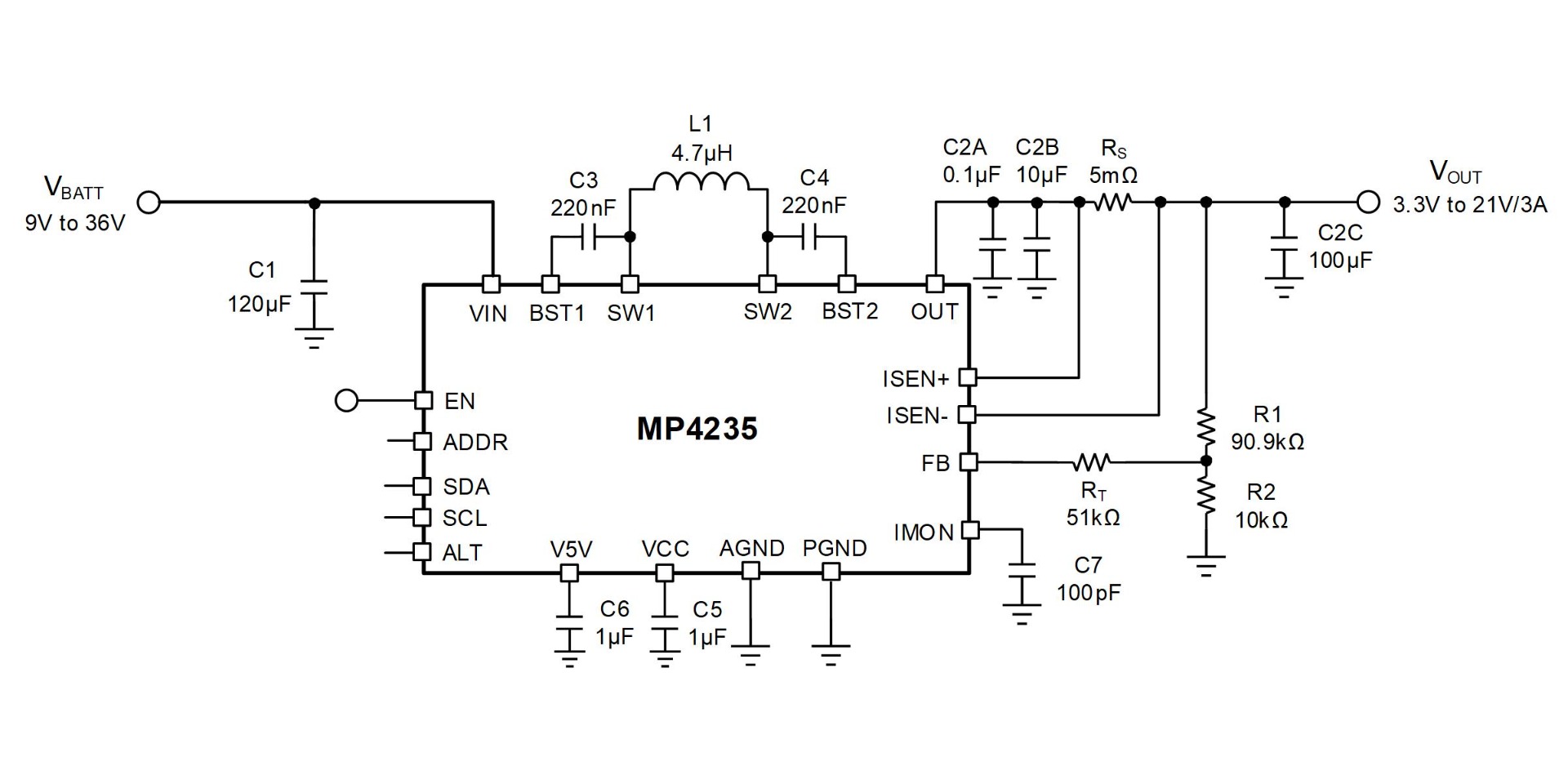 MP4245は入手しやすい標準の外付け部品を最小限の数しか必要としません。MP4245は、QFN21 (4mm x 5mm) パッケージで提供されます。