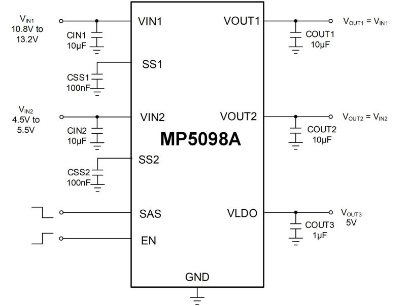 MP5098Aは、最小限の数の外付け部品しか必要とせず、省スペースのTQFN-10 (2mm x 3mm) パッケージで提供されます。