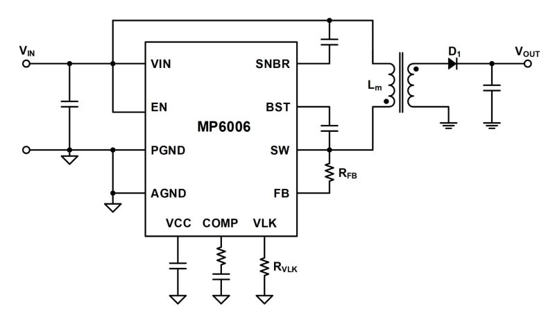 The MP6006 adopts line/load regulation compensation techniques to eliminate the leakage inductance's impact on the output regulation.