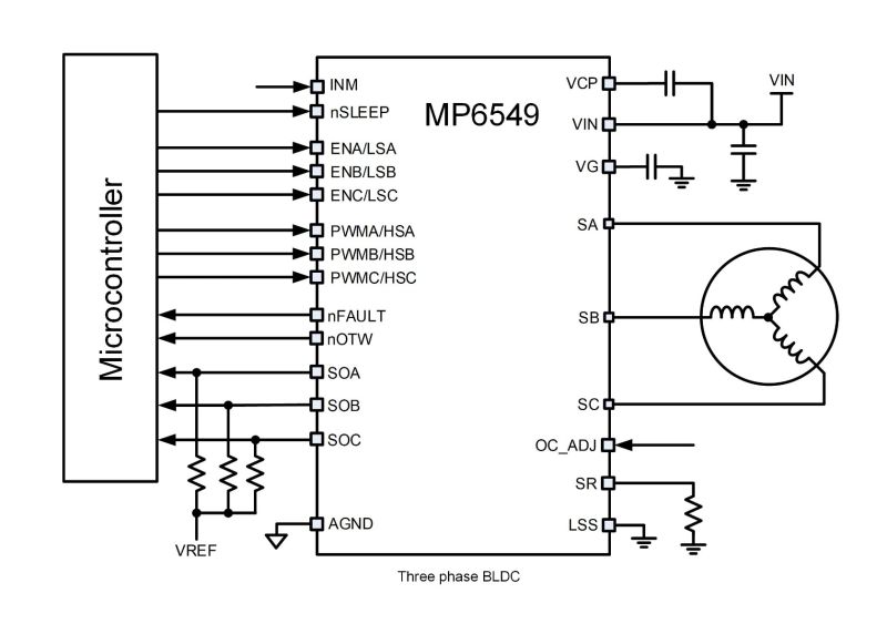 The MP6549 is a three-phase brushless DC motor driver that integrates three half bridges, consisting of 6 N-channel power MOSFETs along with pre-drivers, gate driver power supplies, and current-sense amplifiers.