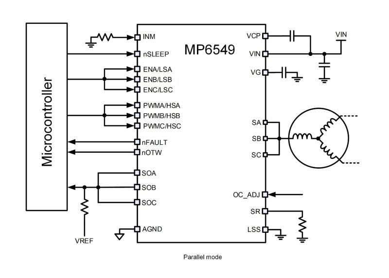 For higher current requirements, three half-bridges can be configured in parallel. The INM pin configures the input interface and parallel mode.