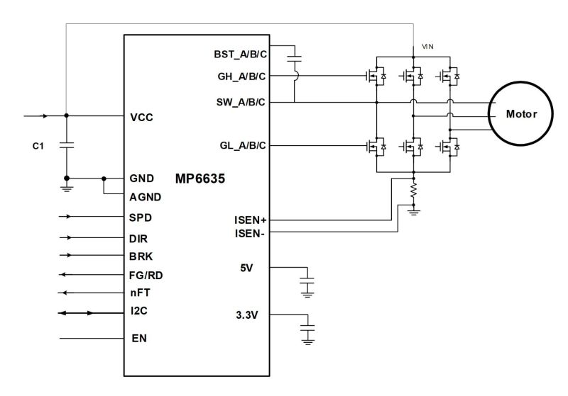 The MPQ6635-AEC1 is a three-phase, sensorless, brushless DC (BLDC) motor driver with a configurable gate driver. It features sensorless field-oriented control (FOC) for improved efficiency and low vibration. The input voltage (VIN) ranges between 6V and 35V.
