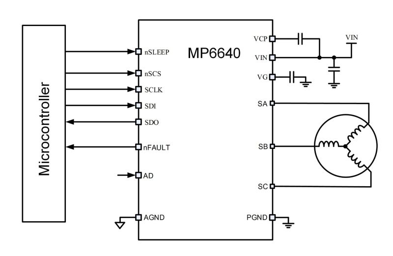 The MP6640 features a serial peripheral interface (SPI) for complete configurations and detailed diagnostics, as well as three configurable pulse-width modulation (PWM) generators are integrated for BLDC motor operation.