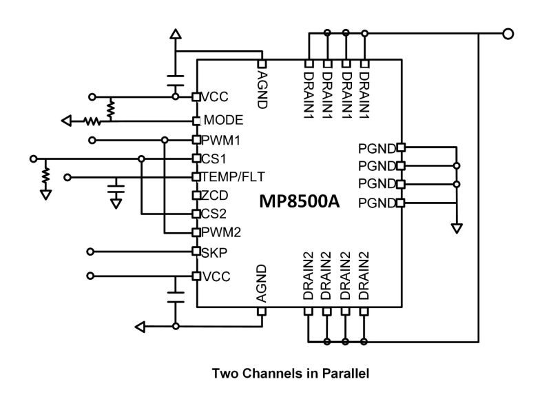 The device supports working in MOSFET-only mode or SR mode. It also supports partial operation skipping if multiple MP8500As are in a parallel circuit, which makes the application more flexible. The highly integrated MOSFET and gate driver offer fast turn-on and turn-off times to enable high power density and high efficiency.