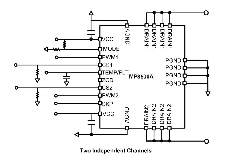 The MP8500A is a dual-channel, high-current, intelligent synchronous rectifier (SR) with an integrated low on resistance (RDS(ON)) MOSFET that is optimized for LLC and full-bridge converters. With its built-in, low-RDS(ON) MOSFET, the device can deliver up to 40A of continuous output current (IOUT) per IC at room temperature. With airflow, the continuous IOUT can reach 50A.