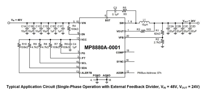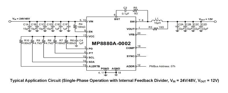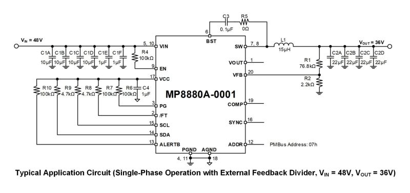 The MP8880A adopts current mode operation to provide fast transient response and simplify loop stabilization. The device implements full protection features, including under-voltage lockout (UVLO), over-voltage protection (OVP), over-current protection (OCP), and thermal shutdown. The MP8880A supports paralleled operation with up to 4 phases for a higher IOUT. Refer to the MP8880A datasheet for more detailed information.