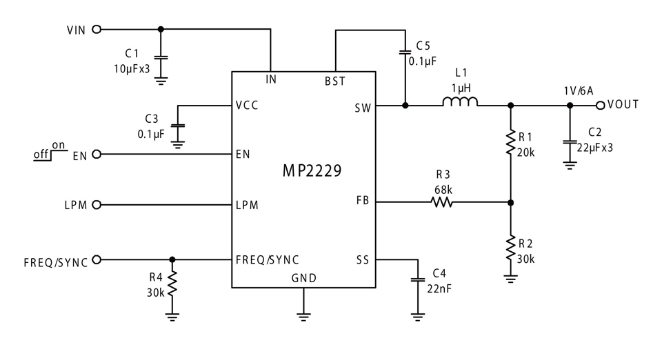 外部同期、低電力モードおよび外部ソフトスタート付き、高効率、21V、6A、同期整流ステップダウンコンバータ