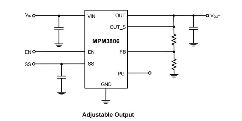- 固定出力オプション : 0.8V、1V、1.1V、1.2V、1.25V、1.5V、1.8V、2.5V、2.8V、または3.3V