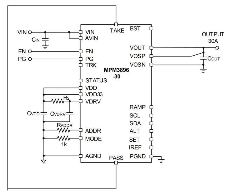 The MPM3896-30 is a fully integrated, stackable, synchronous buck module series with a PMBus interface. It offers a complete power solution that integrates a controller, half-bridge FET, and power inductor, offering excellent load and line regulation across a wide 2.8V to 6V input voltage (VIN) range and 0.3V to 0.9 x VIN output voltage (VOUT) range. The MPM3896-30 operates at high efficiency across a wide output current (IOUT) range.